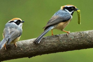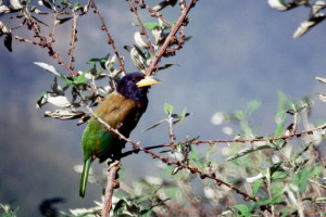 Behavior and Diet Megalaima virens is mainly frugivorous, feeding on a variety of wild fruits, figs, and berries, though it also consumes insects and nectar occasionally. Its strong beak helps