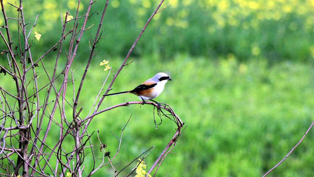The long-tailed shrike is medium-sized with a sleek body, rufous flanks, and a distinctive black facial mask that stretches from the beak across the eyes. Its back is greyish, and the wings and tail are contrastingly darker. As an expert predator, it often perches on exposed branches or wires, from where it hunts insects, lizards, and even small birds.