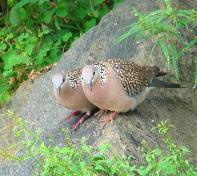 Description The dove has white –spotted, pinkish-brown and grey upperparts, and white chessboard image on its hind neck—leading clue to its identify.  The sexes are alike. The dove stays in pairs or parties, in open wooded country, cart tracks, etc—affects open well-wooded and cultivated country; and avoids arid tracts. It becomes quite tame and confiding if unmolested, freely entering gardens and verandas of bungalows. Flights as of other doves, is swift and strong, attained by vigorous wing strokes.