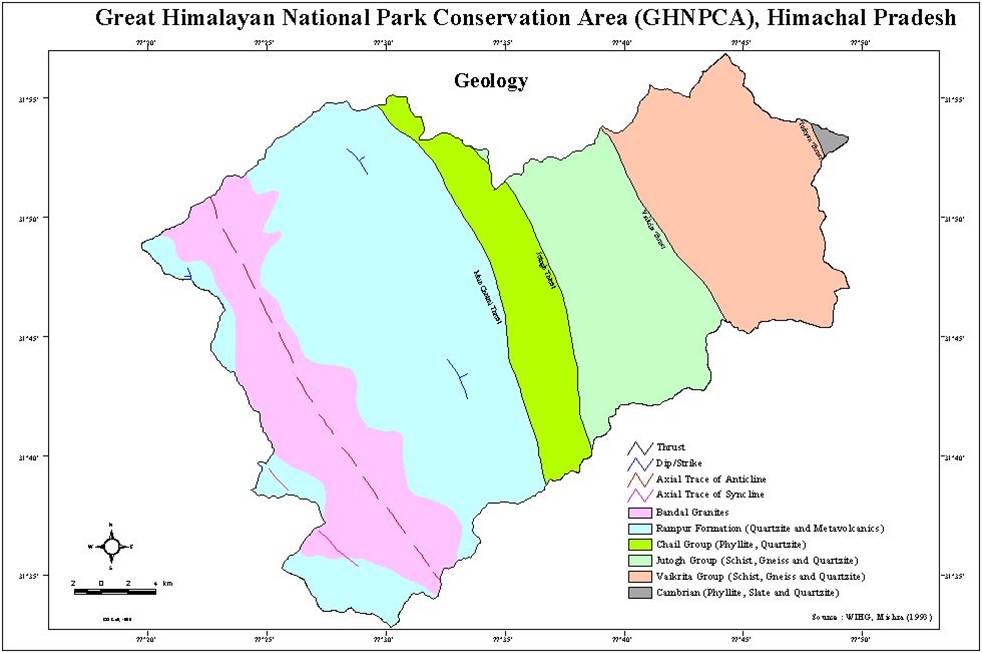 GHNPs geology is characterised by two major types of rock formation. Those of the Lesser Himalaya are crystalline in nature, whilst those of the Great Himalayan range are principally metamorphic .
