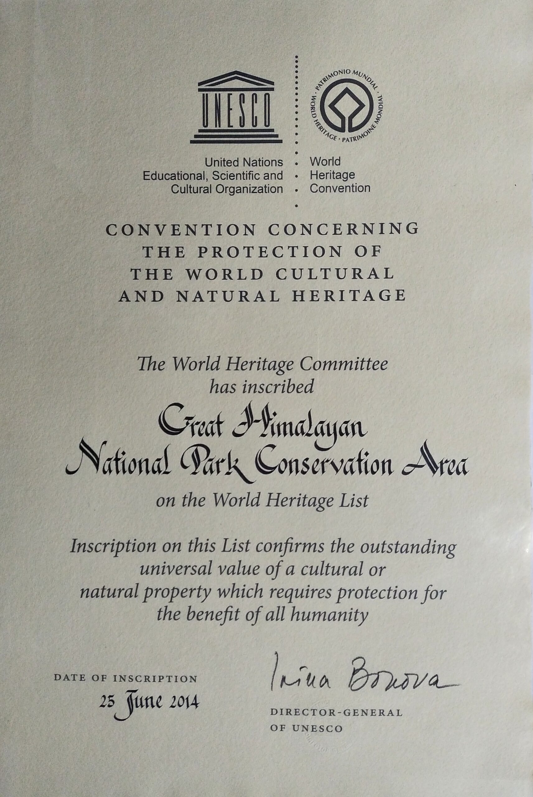 In 2014, the Great Himalayan National Park was officially awarded World Heritage Natural Site status during the 38th World Heritage Committee meeting held in Doha, Qatar. During this process, it was decided that the Sainj Wildlife Sanctuary and Tirthan Wildlife Sanctuary, while part of the protected region, would remain separate from the national park, continuing as independent wildlife sanctuaries.